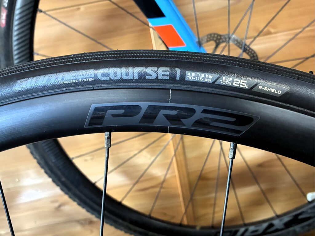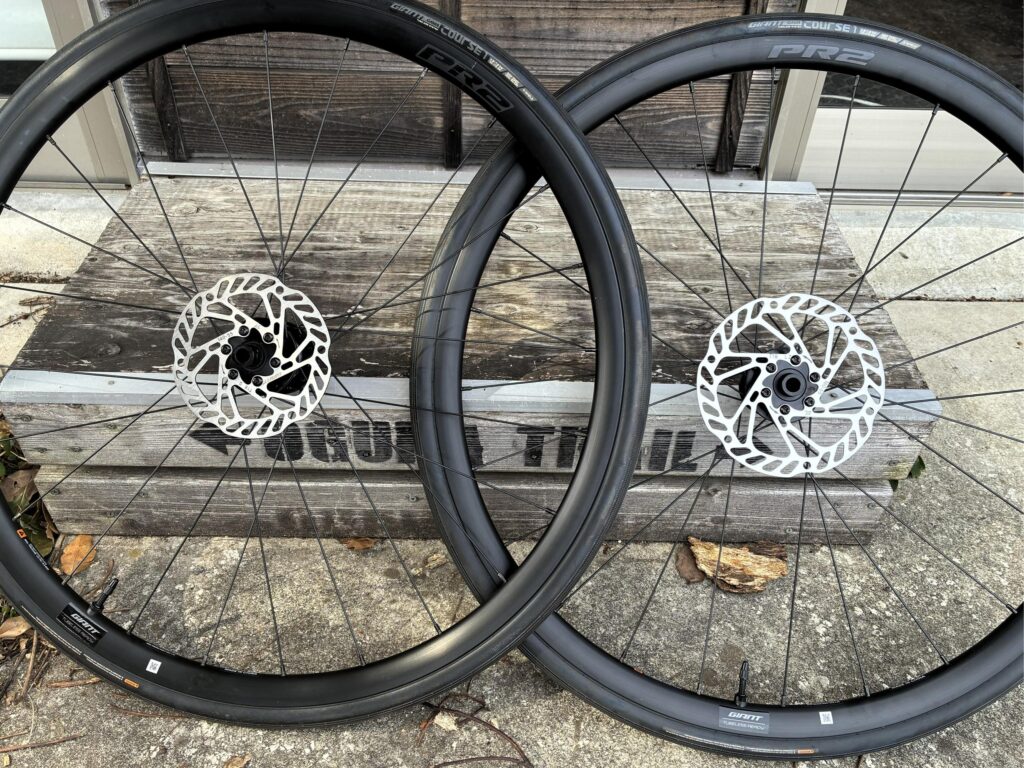 完成車から外した「Giant P-R2ホイールセット」になります。未使用品です。タイヤ(Giant Gavia Course 1, tubeless, 700x25c(28mm))、ディスクローター(s[F]160mm, [R]140mm)、チューブレス用リムテープ、バルブも完成車から外したままついております。スプロケットだけご用意いただければそのままご使用いただけます。